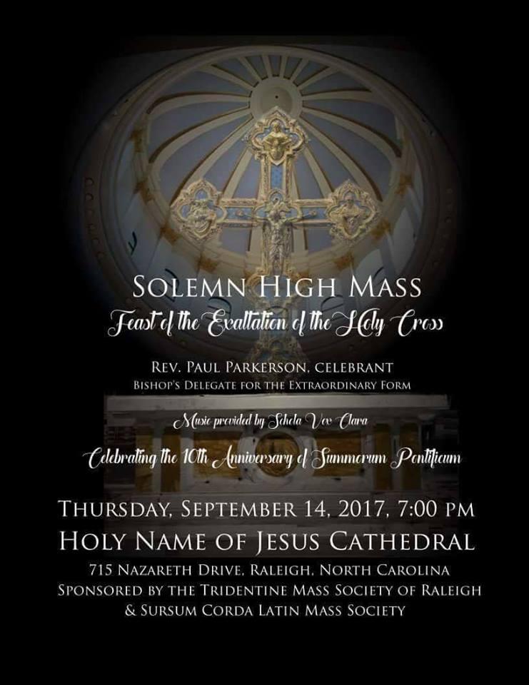 2. Feast of the Holy Cross, Raleigh – September 14: We have a new sister organization in Raleigh, the Tridentine Mass Society of Raleigh and they are hitting the ground running. On Thursday September 14th 7pm, they are sponsoring a Solemn High Mass at the new Holy Name of Jesus Cathedral in Raleigh. Please see the attached flyer for details.