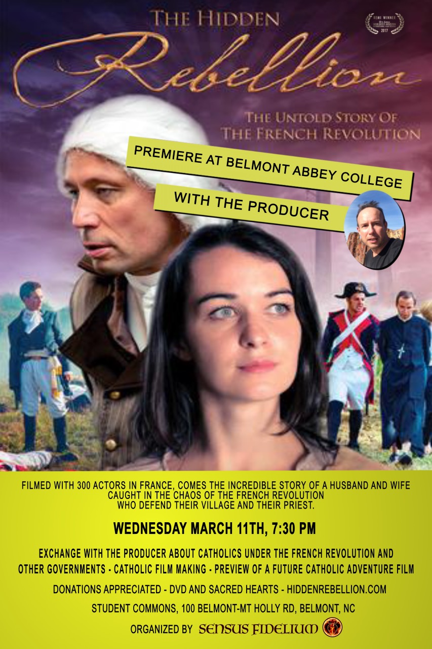 The Hidden Rebellion movie premiere – Wednesday March 11, 7:30pm at Belmont Abbey College (Student Commons building): Sensus Fidelium, run by our friend Steve Cunningham is hosting a viewing of the Hidden Rebellion, a movie about the Vendee martyrs in France in 1793 who rose up to defend the Catholic faith against the French Revolutionary government. This is a Catholic film produced by Catholic filmmaker Daniel Rabourdin who will be present at the premiere to answer questions about the film and about the Vendee rebellion. For local questions contact Steve Cunningham at: steve@sensusfidelium.us Please see below image for movie details or visit the film website at: https://www.hiddenrebellion.com/