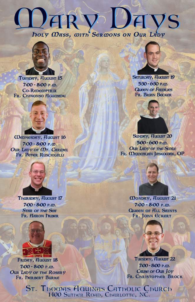 St. Thomas Aquinas is hosting its annual Mary Days during August which features Masses, and a sermon on the Blessed Mother by a visiting priest. On Thursday August 17, 7pm, during the regularly scheduled Latin Mass, Fr. Aaron Huber will provide a talk on the Marian title, Star of the Sea. See details in the attached image.