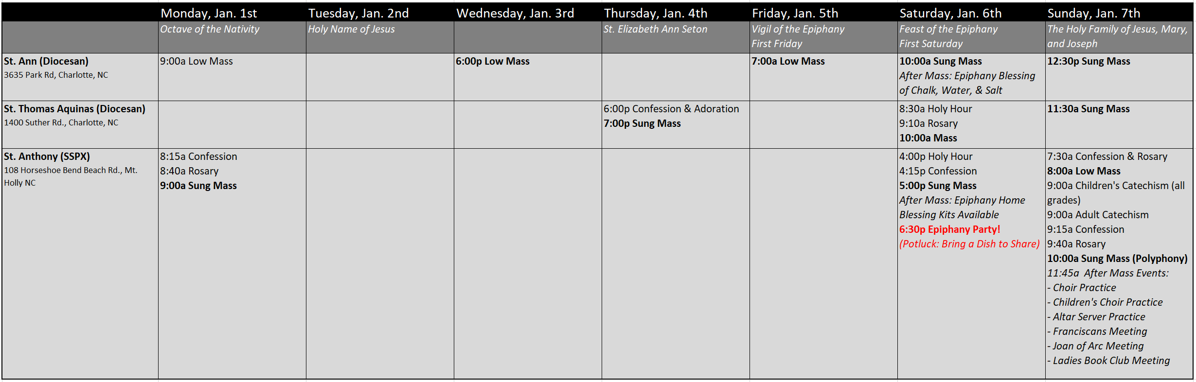 January 2, 2024 by CLMC Charlotte area Latin Mass Schedule for Epiphany and Following Week Share this: Click to share on X (Opens in new window) X Click to share on Facebook (Opens in new window) Facebook Like Loading... Related