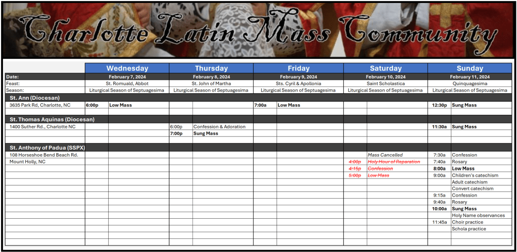 February 6, 2024 by CLMC Schedule Updates for the Week The Holy Family (Rest on the Flight into Egypt). Murillo c. 1665. The month of February is dedicated to the Holy Family. Note that since Diocesan parish websites will no longer list Latin Mass times, if you need to verify any information you must call parish offices. Share this: Click to share on X (Opens in new window) X Click to share on Facebook (Opens in new window) Facebook Like Loading... Related