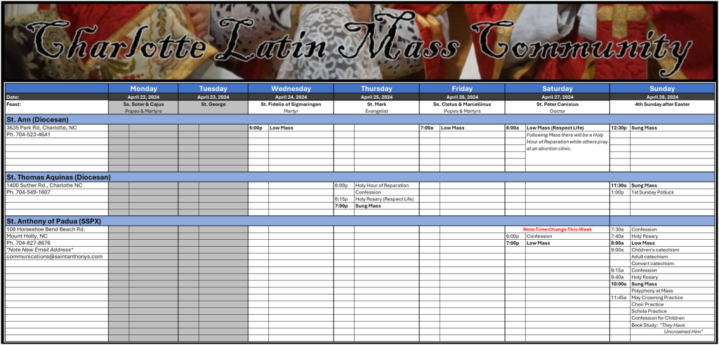 Please see the attached schedules of Latin Masses for the Charlotte area: