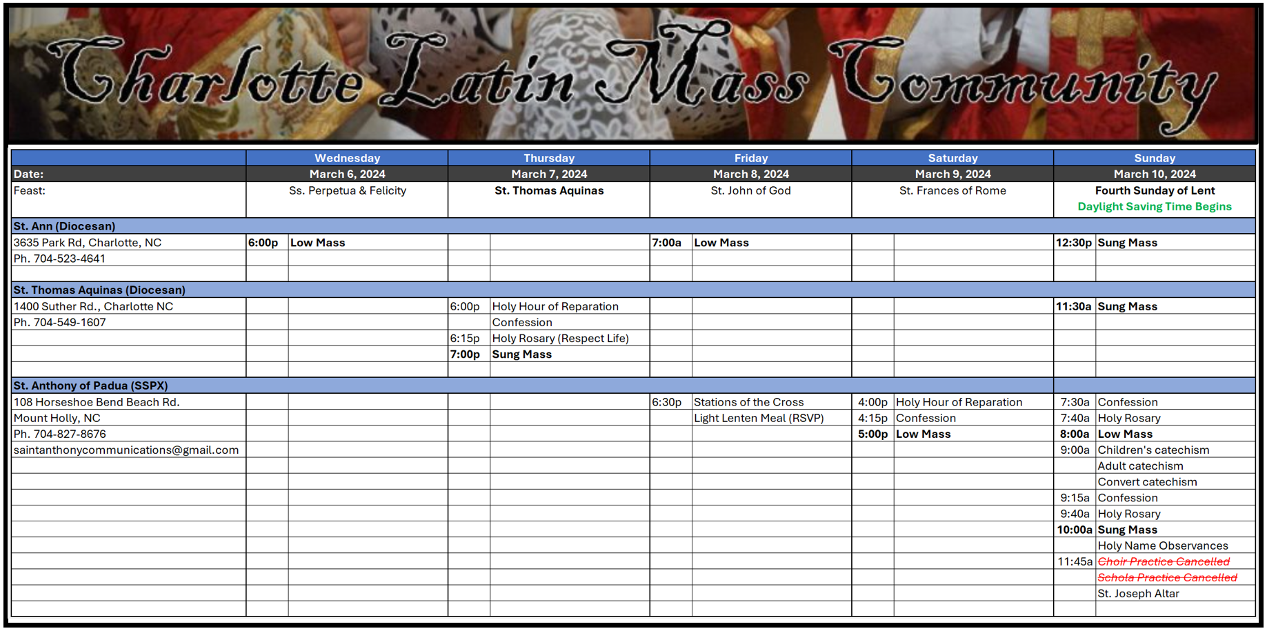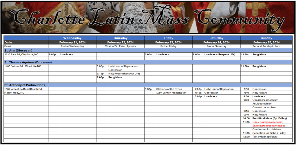 2. Charlotte Latin Mass Schedule for the Coming Week: