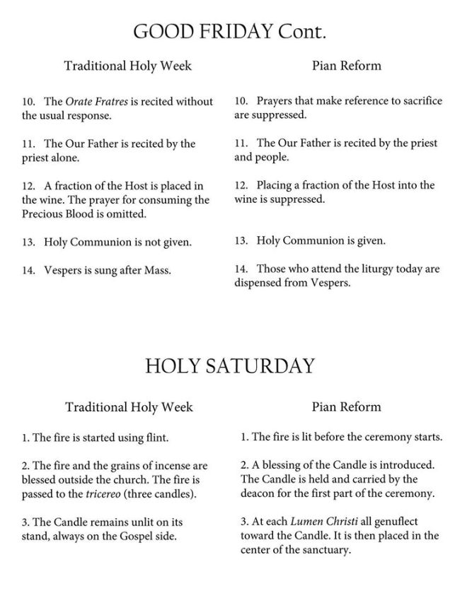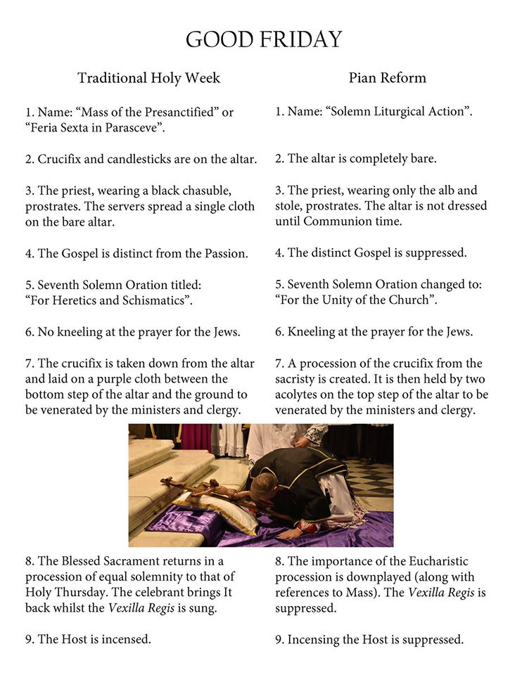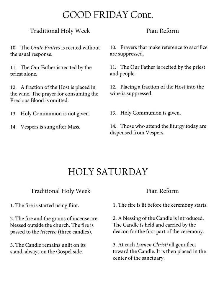 The Pre-1955 Easter Triduum is a rich, sacred liturgy filled with much more beauty and symbolism which dates back centuries. Here are some of the differences you may notice. Please note these are layman descriptions and are just meant to give an overall perspective of the differences: