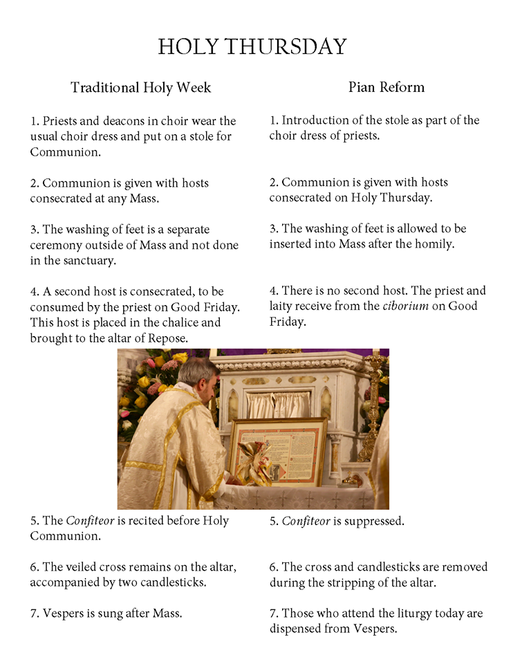 - No washing of feet on Holy Thursday: As Christ washed the feet of only his priest-apostles, the washing of feet in the ancient liturgy was intended as a sign of priestly consecration. This ceremony was separate from the liturgy and reserved only for priests and brothers. Thus this will not be conducted.