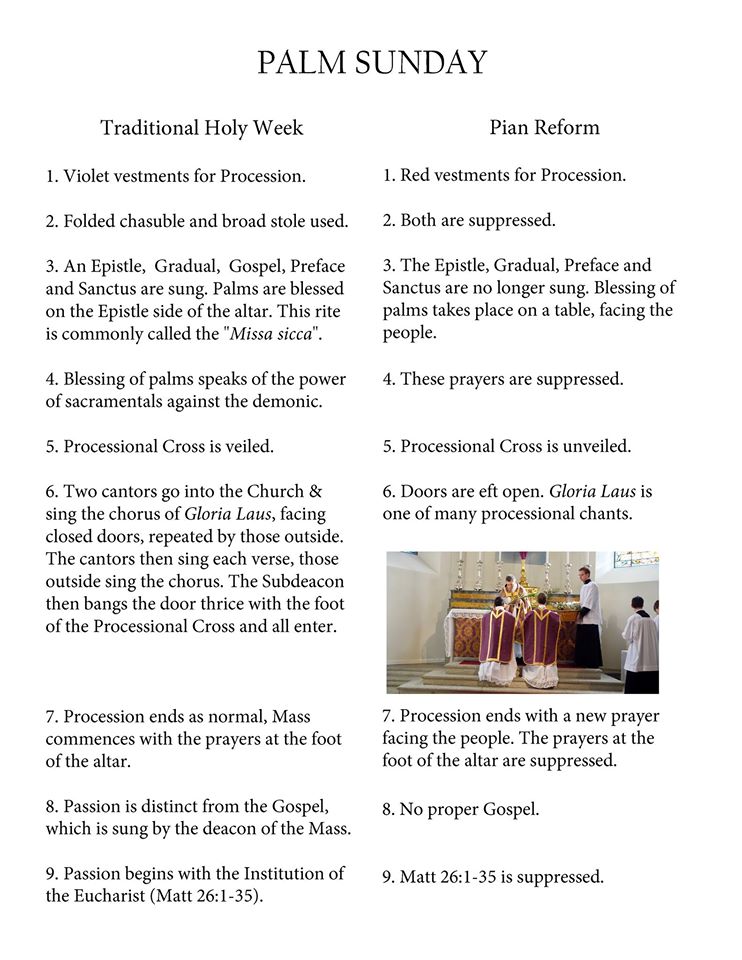 Palm Sunday: Not discussed above, but worthy of mention is the Pre-1955 Palm Sunday, which basically includes 2 liturgies into 1 Mass. The Blessing of Palms is the first liturgy (which occurs on the altar, and features its own readings, propers, etc., and even a semi-Canon). The “Holy Communion” of the Palm Blessing is the distribution of Palms. The second liturgy is that of the Palm Sunday Mass.